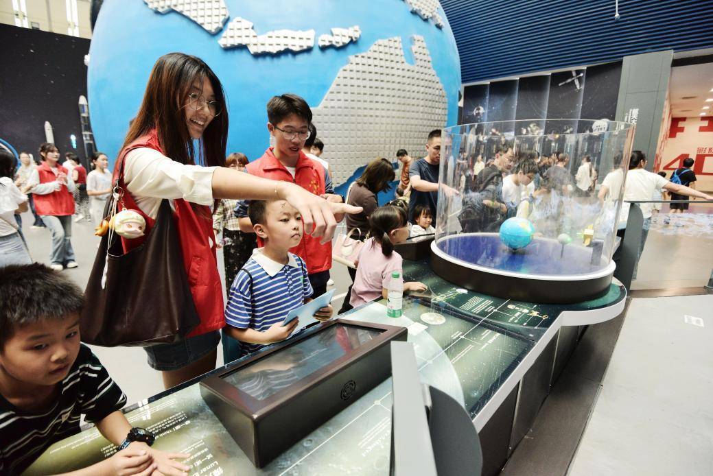 在主题展馆探索环节,家庭分为两组展开沉浸式研学:A组在大学生志愿者与视觉导览的辅助下,先后参观航空航天厅与机器人世界;B组则通过手语翻译与实验演示,深入声光奥秘厅与生命科学厅进行学习。
